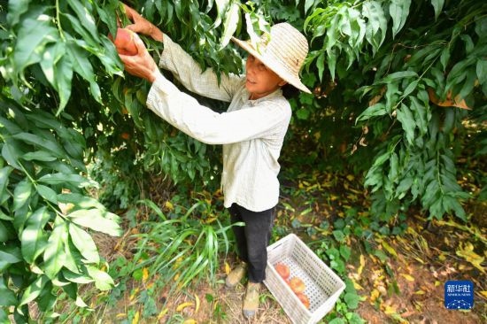 7月7日,在臨湘市聶市鎮(zhèn)乘嶺社區(qū)的涓湖果園,果農(nóng)在采摘蟠桃。