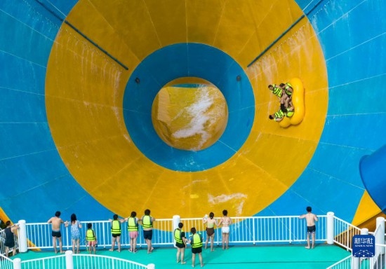7月8日,游人在湖北省襄陽市華僑城奇夢海灘水樂園游玩(無人機照片)。