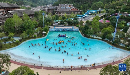7月8日,游客在安徽省蕪湖市南陵縣大浦鄉(xiāng)村世界的海嘯館戲水游玩。