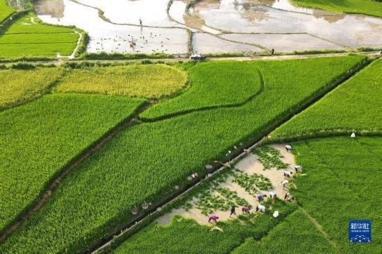 7月11日,在湖南省婁底市雙峰縣井字鎮(zhèn)花山村,農民在田間起秧(無人機照片)。