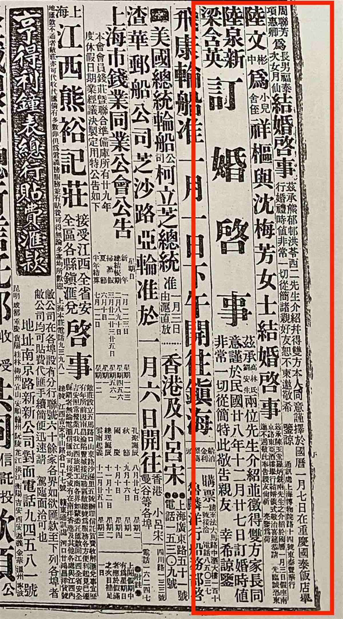 據(jù)了解,登報結(jié)婚最早在民國風行。當時,婚姻法和婚姻登記制度并不完善,于是結(jié)婚時在報紙上公示成為一種約定俗成的習慣。一來知會了遠近親友,二來有一定法律效力,日后可以作為憑證。三來報紙便于長久保存,更具紀念意義。