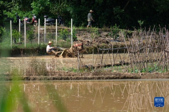 7月21日,農(nóng)民在南寧市青秀區(qū)長塘鎮(zhèn)平整田地。新華社記者 周華 攝