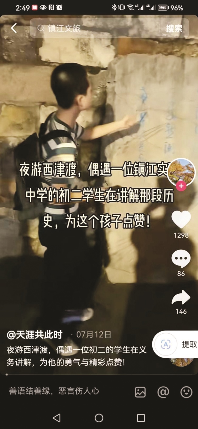 揚子晚報訊(記者 萬凌云 通訊員 湯婉蓉 孫冬)“人類的歷史與功績會隨著時間而消失。但是中國將在他們身上繼續(xù)存在,我們將保持他們高舉的旗幟……”7月22日,一段鎮(zhèn)江初中學(xué)生講解歷史的視頻爆火,他們的講解地位于歷史底蘊深厚的鎮(zhèn)江西津渡景區(qū)。