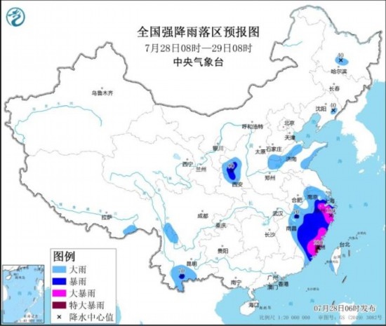 全國強(qiáng)降雨落區(qū)預(yù)報(bào)圖(7月28日08時(shí)-29日08時(shí))