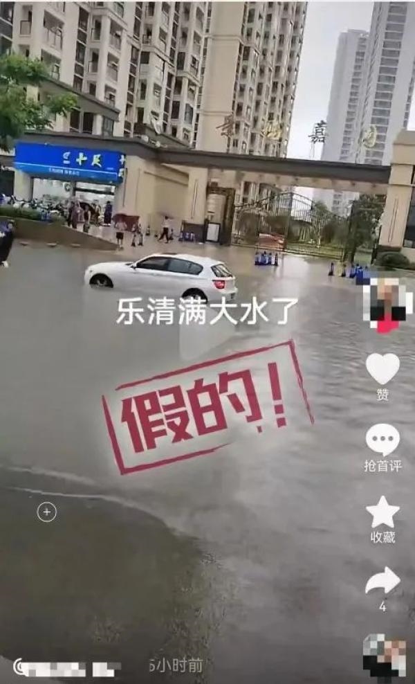 巡查還發(fā)現(xiàn)有網(wǎng)民發(fā)布視頻,標(biāo)有文字“樂清滿大水了”,內(nèi)容可見有小區(qū)門口積水嚴(yán)重,在道路停放的幾輛汽車被淹至車身一半。經(jīng)核實,該視頻并非發(fā)生在樂清。發(fā)布視頻的網(wǎng)民陳某某(男,43歲)為吸引眼球捏造事實,在某平臺賬號發(fā)布,造成負(fù)面影響,已被警方依法給予行政處罰。