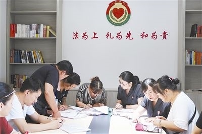 圖①:干警聯(lián)合調(diào)解員在“萬家法律驛站”進(jìn)行調(diào)解。