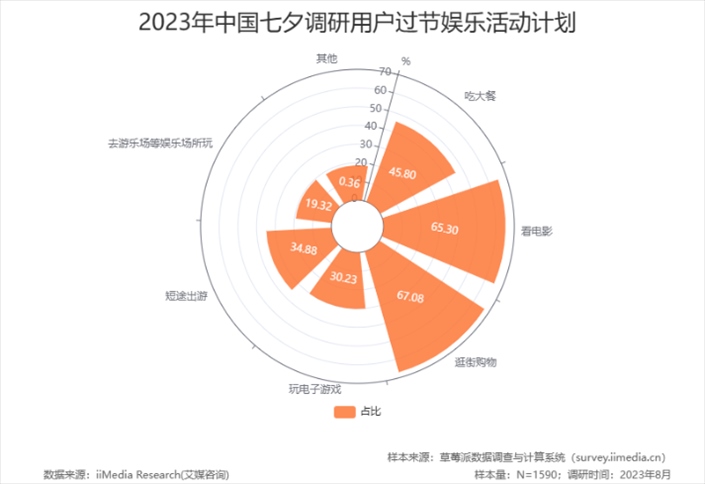 今年七夕恰逢工作日,大多數(shù)人選擇下班后再相聚。“中國七夕節(jié)日消費行為大數(shù)據(jù)調(diào)查”顯示,2023年消費者過節(jié)的娛樂活動計劃TOP3分別為:逛街購物、看電影、吃大餐。