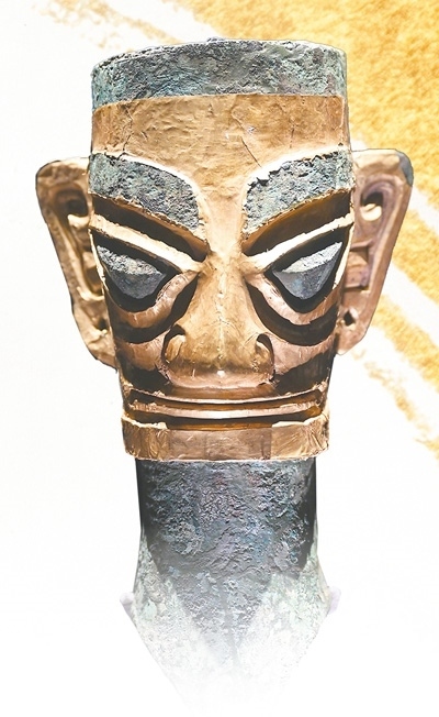 三星堆博物館新館的戴金面罩青銅人頭像。新華社記者 劉 坤攝
