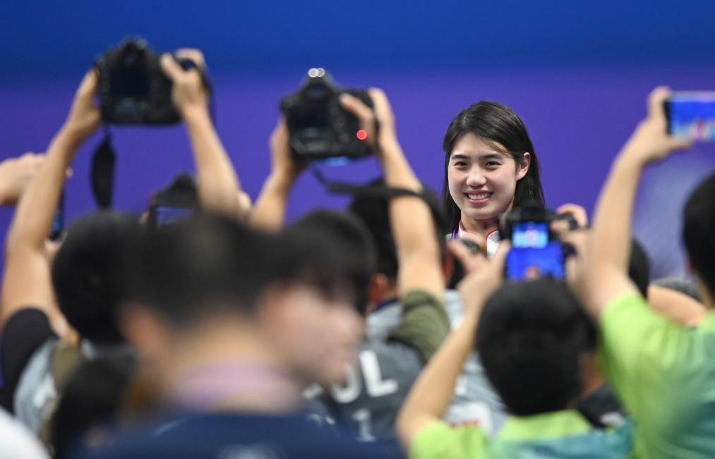 9月29日,中國選手張雨霏在賽后留影。新華社記者 黃宗治 攝