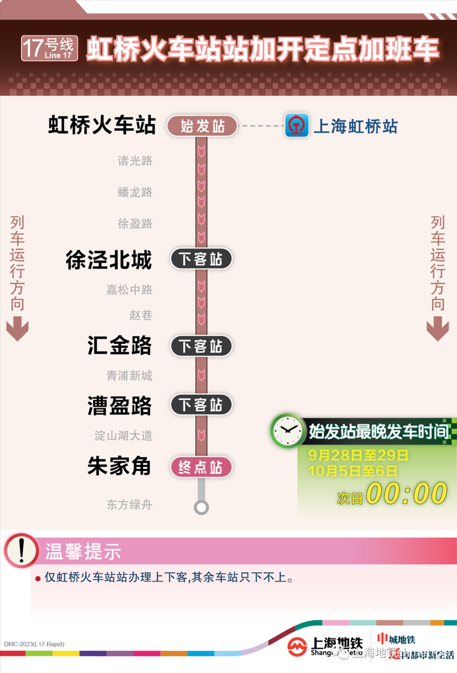 根據(jù)鐵路虹橋站夜間到達列車開行情況,9月28日、9月29日、10月5日、10月6日,鐵路在原夜間圖定計劃的基礎上增加了開行班次。為應對鐵路臨時加開,做好虹橋火車站夜間列車集中到達大客流疏散工作,虹橋樞紐相關的地鐵2、10、17號線在既定延時或加開方案的基礎上進一步增開定點加班車。其中,9月28日至29日、10月5日至6日夜間,虹橋火車站定點加班車最晚發(fā)車時刻為:2號線至次日2:00、10號線至次日0:30、17號線至次日0:00。同時,9月30日至10月4日,2號線和10號線虹橋火車站定點加班車發(fā)車時刻推遲至次日0:20。