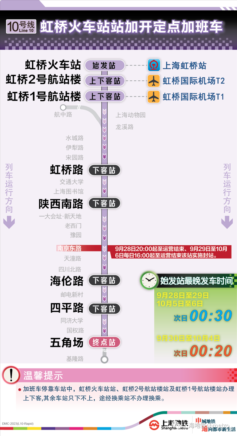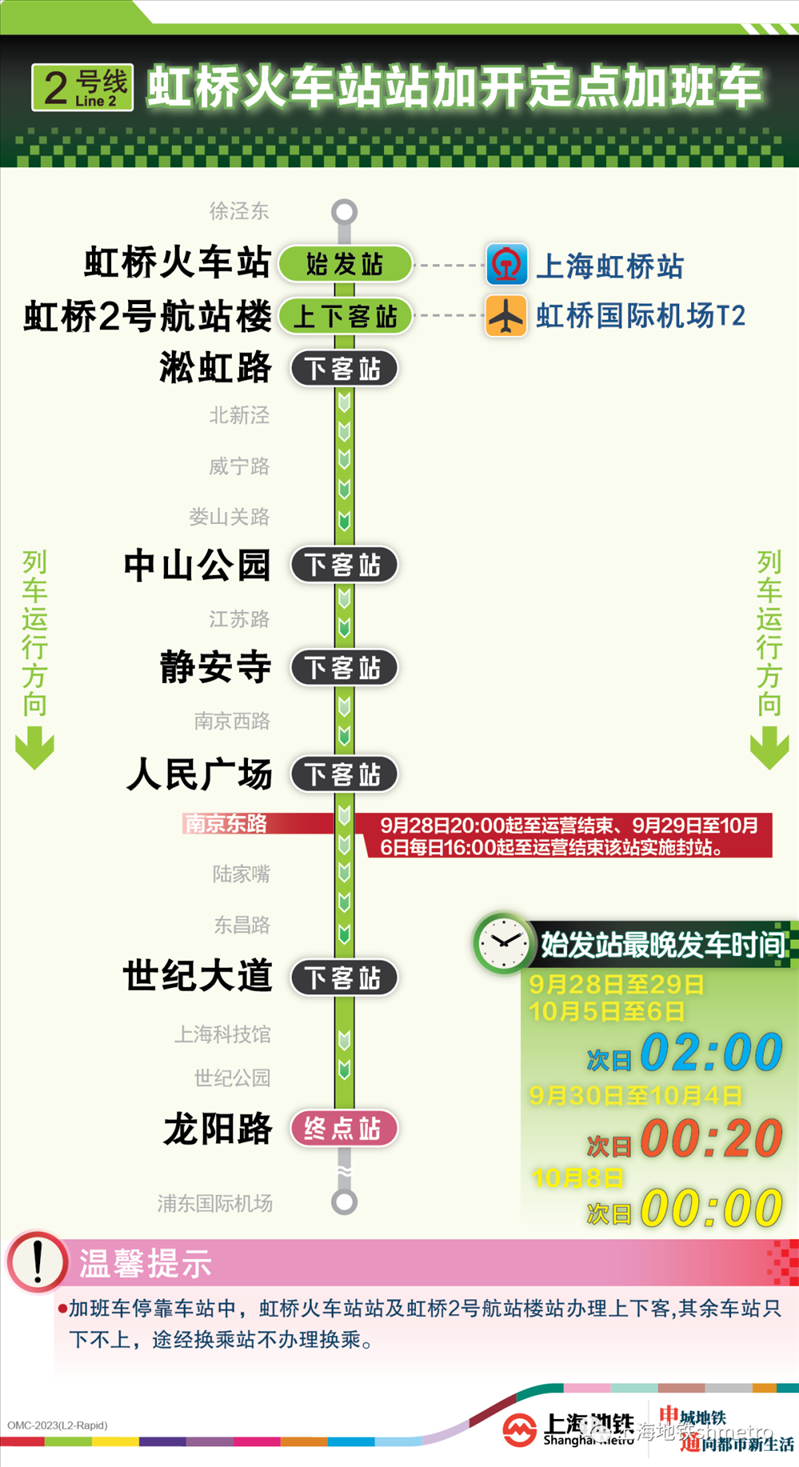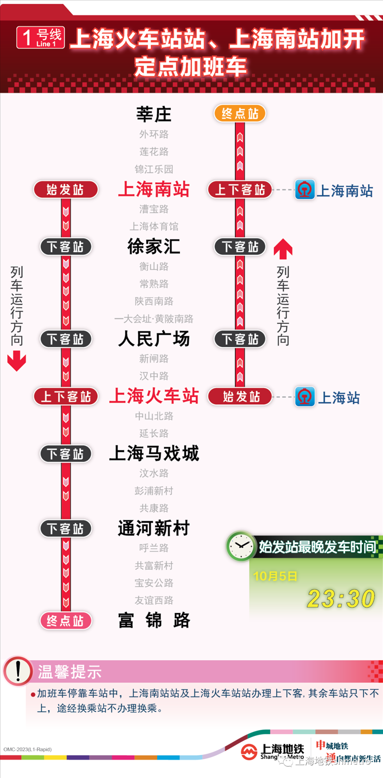 此外為做好節(jié)假日返程期間上?;疖囌?、虹橋火車站、上海南站的夜間客流疏散工作,10月5日,地鐵1號線在圖定基礎上實施定點加開方案,加開末班車發(fā)車時間至23:30;另10月8日地鐵2號線增加定點加班車班次,加開末班車發(fā)車時間至次日0:00。