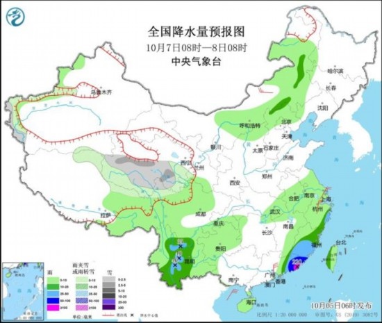 10月5日08時至6日08時,青海中西部、甘肅西部、西藏北部等地有小到中雪或雨夾雪,青海西北部局地有大雪,西藏東南部、陜西中南部、四川北部和東南部、貴州西北部、云南東北部、臺灣島等地部分地區(qū)有大到暴雨,其中,臺灣島東部部分地區(qū)有大暴雨,局地特大暴雨(250~320毫米)。內(nèi)蒙古中東部、黑龍江東北部、湖南北部、浙江等地部分地區(qū)有4~6級風。