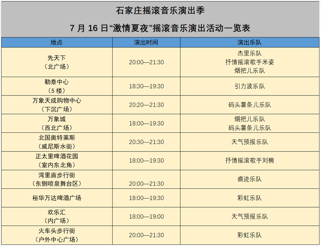 當?shù)孛襟w早前報道稱,9月16日至24日,由河北省商務(wù)廳、石家莊市人民政府聯(lián)合主辦的河北·澳門美食音樂消費節(jié)暨河北金秋消費季活動在石家莊舉辦?;顒庸舶厣朗彻?jié)、音樂休閑節(jié)、激情購物節(jié)三個板塊。其中,音樂休閑節(jié)于每天18時30分至22時30分在石家莊正太廣場舉辦。十余位歌手、6支樂隊帶來精彩的音樂演出,豐富市民游客文化體驗,演出曲目風(fēng)格包含搖滾、民謠、爵士、抒情等。