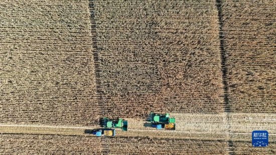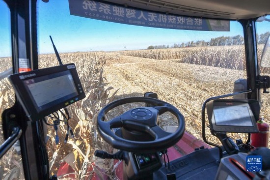 10月19日,在中國科學(xué)院“黑土糧倉”科技會戰(zhàn)長春示范區(qū)公主嶺示范基地,無人駕駛農(nóng)機在收獲玉米。