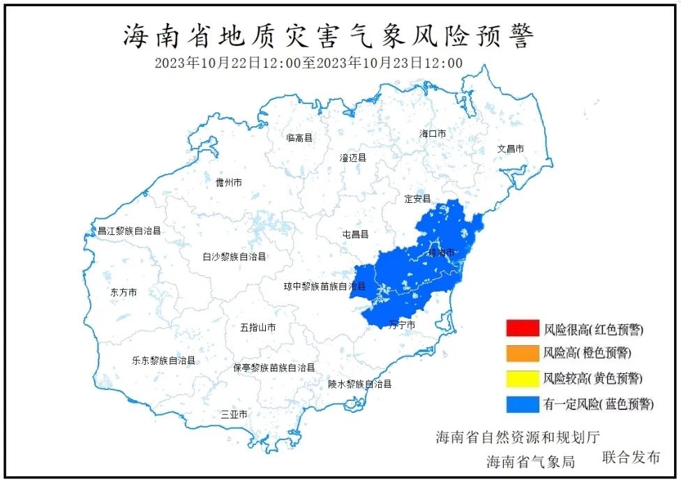 海南省自然資源和規(guī)劃廳、海南省氣象局2023年10月22日10時聯(lián)合發(fā)布地質(zhì)災(zāi)害氣象風(fēng)險預(yù)警:根據(jù)海南省氣象臺前期降雨實況和未來24小時降雨預(yù)報,預(yù)計未來24小時(2023年10月22日12:00-10月23日12:00)瓊海市全境,萬寧市龍滾鎮(zhèn)、三更羅鎮(zhèn)、北大鎮(zhèn),瓊中縣中平鎮(zhèn)降雨誘發(fā)地質(zhì)災(zāi)害有一定風(fēng)險,為Ⅳ級風(fēng)險預(yù)警(藍色預(yù)警)。請上述市縣、鄉(xiāng)鎮(zhèn)政府及有關(guān)部門做好地質(zhì)災(zāi)害防御工作。