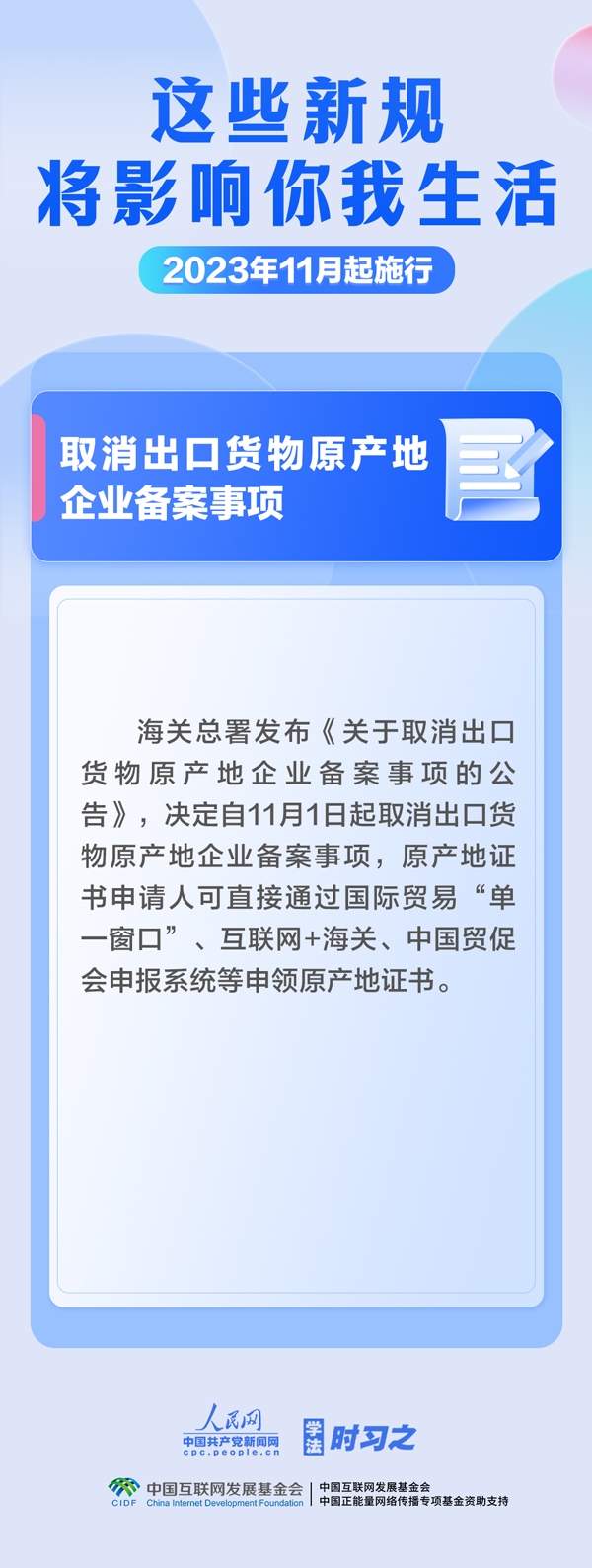 調(diào)整最高法知產(chǎn)法庭審理上訴案件范圍;簡化債券發(fā)行人員任職資格審批程序;取消出口貨物原產(chǎn)地企業(yè)備案事項(xiàng)……11月,這些新規(guī)施行,將影響你我生活。