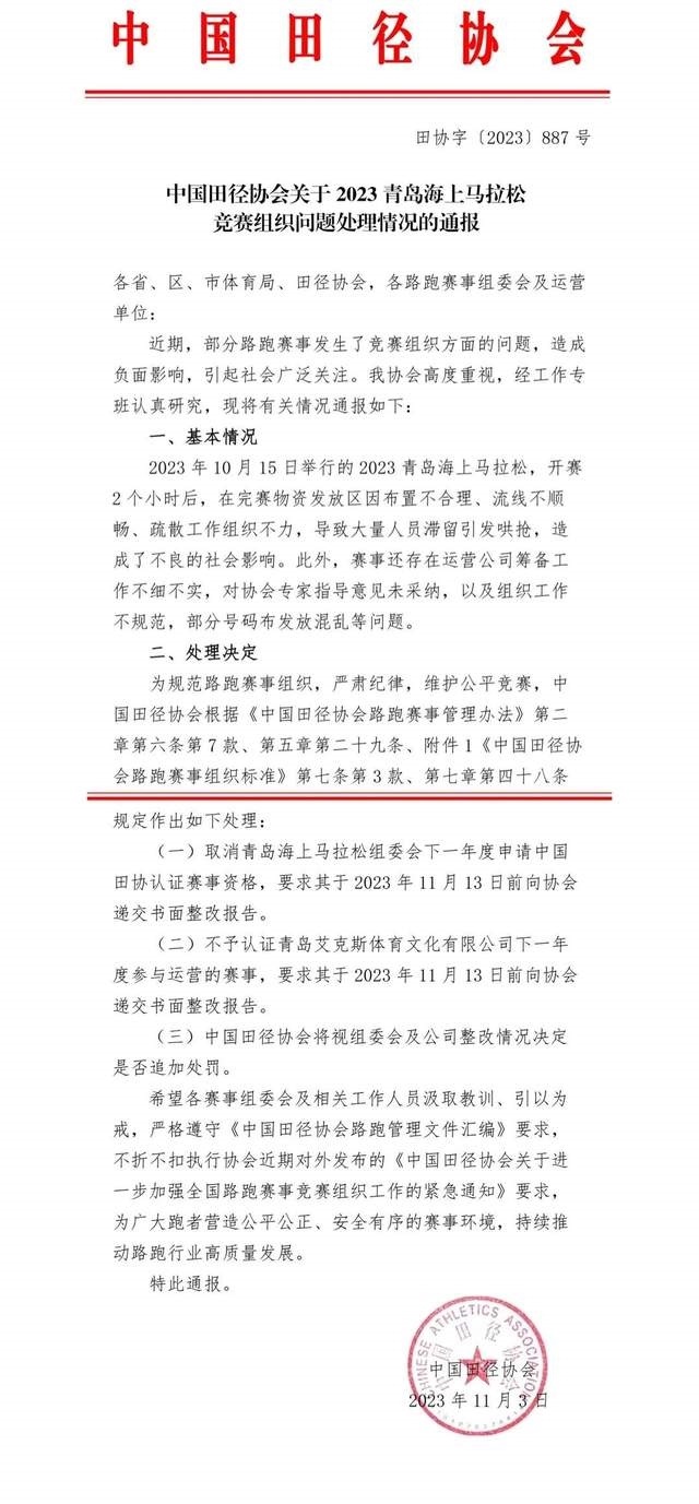 央視網(wǎng)消息:據(jù)“中國馬拉松平臺”官微消息,近日,部分路跑賽事出現(xiàn)了一些競賽組織問題,引發(fā)社會廣泛關(guān)注,造成了不良的社會影響。中國田徑協(xié)會高度重視、全面調(diào)查,依據(jù)事實(shí)和路跑賽事管理規(guī)定,從加強(qiáng)競賽組織,壓實(shí)各方主體責(zé)任,提示行業(yè)風(fēng)險(xiǎn)隱患的角度,對相關(guān)單位和人員進(jìn)行了相應(yīng)處理?,F(xiàn)將處理情況通報(bào)如下: