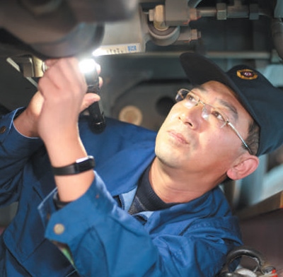 時(shí)而膝蓋微弓,腰部略彎;時(shí)而敲敲打打,上前細(xì)嗅……只見劉波進(jìn)車廂、鉆車底、登車頂,對列車逐一進(jìn)行檢查,不一會兒,動車隱患就被及時(shí)發(fā)現(xiàn)并排除。