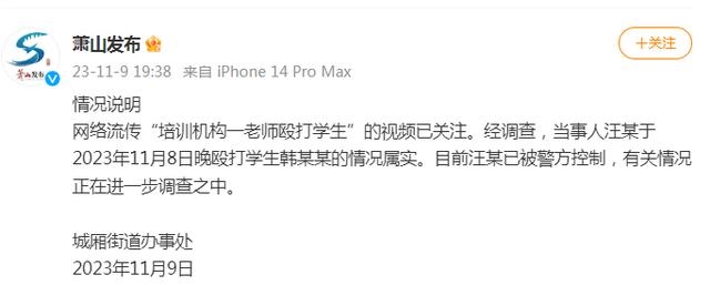 ·杭州蕭山通報“培訓(xùn)機(jī)構(gòu)一老師毆打?qū)W生”:屬實,打人者已被警方控制。