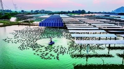 在廣西壯族自治區(qū)南寧市上林縣白圩鎮(zhèn)登山村,養(yǎng)殖戶在光伏板旁給鴨子喂食?!皾O光互補”拓寬了當?shù)刂赂辉鍪盏那?。潘永攝