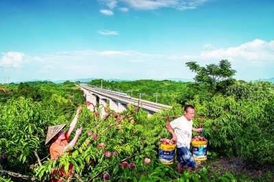 湖南省芷江侗族自治縣的果農在鐵路橋附近摘桃子。高鐵的建設開通對沿線群眾發(fā)展產業(yè)有著積極作用。李小平攝
