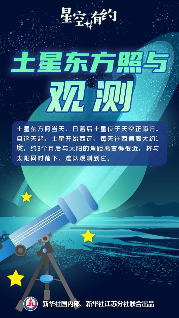 “土星東方照當天,日落后土星位于天空正南方。自這天起,土星開始西沉,每天往西偏離大約1度,約3個月后與太陽的角距離變得很近,將與太陽同時落下,難以觀測到它?!蓖蹩瞥f。