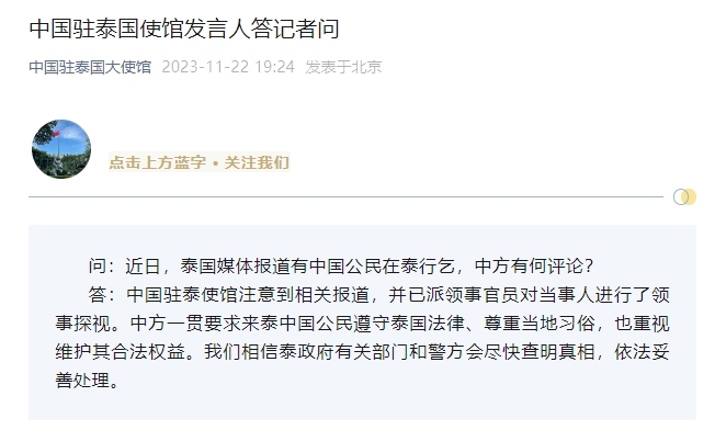 ·中國駐泰國大使館回應(yīng)網(wǎng)傳有中國公民在泰行乞:注意到相關(guān)報(bào)道,并已派領(lǐng)事官員對當(dāng)事人進(jìn)行了領(lǐng)事探視。