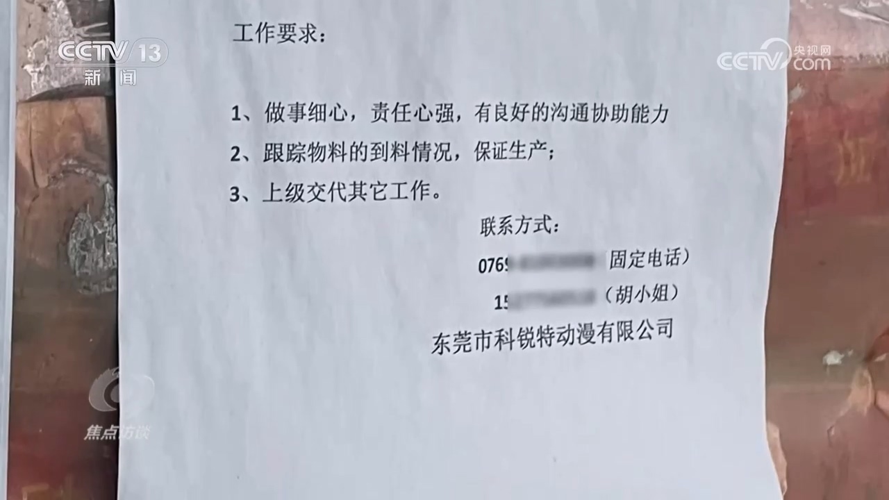 隨后,記者在佳輝公司的門口看到了幾張招工啟示,其中一張的招工單位落款正是科銳特公司,看來,兩家公司必定有所關聯(lián)。于是,記者想辦法再次進入到了“佳輝”的生產(chǎn)車間,發(fā)現(xiàn)工人們正在生產(chǎn)所謂的“美少女”手辦的組合部件。
