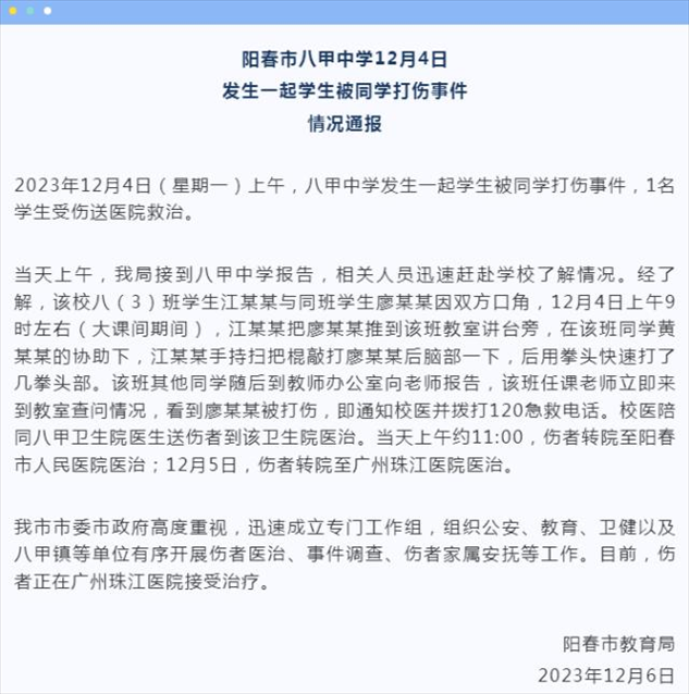 ·廣東陽(yáng)春一中學(xué)生疑被同學(xué)打成植物人?官方通報(bào):成立專(zhuān)門(mén)工作組。