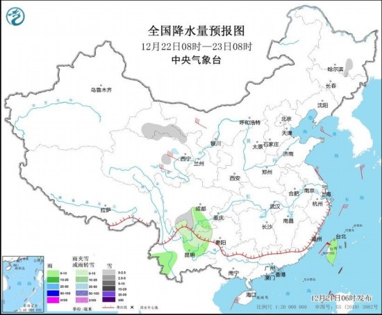 圖4 全國降水量預(yù)報(bào)圖(12月22日08時(shí)-23日08時(shí))