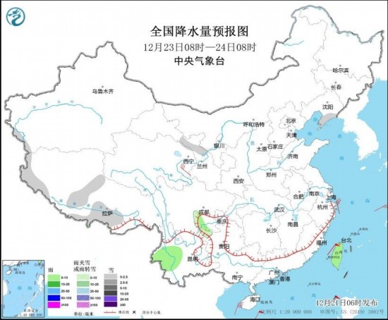 12月23日08時(shí)至24日08時(shí),遼東半島、西藏南部和西部、甘肅河西等地部分地區(qū)有小雪或雨夾雪。四川盆地西南部、云南西部、臺(tái)灣島等地部分地區(qū)有小雨。青海東部、浙江東部等地部分地區(qū)有4~6級(jí)風(fēng)(見圖5)。