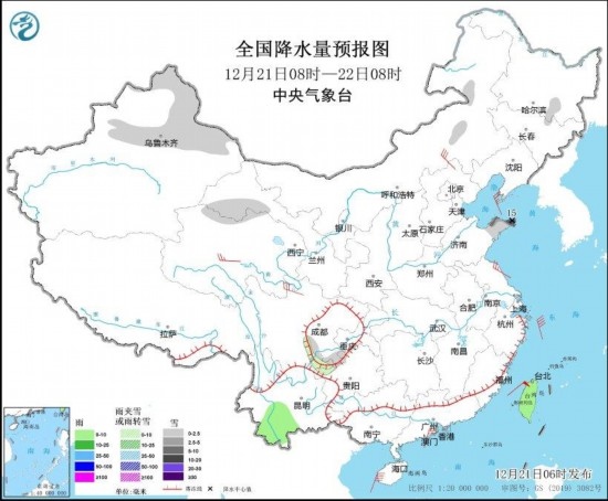 12月21日08時(shí)至22日08時(shí),新疆北部、甘肅河西、黃淮東部等地部分地區(qū)有小雪或雨夾雪,其中,山東半島等地部分地區(qū)有中到大雪,局地暴雪(10~15毫米)。云南西南部和中部、臺(tái)灣島等地部分地區(qū)有小雨。內(nèi)蒙古東南部、青海北部、江蘇中部、川西高原北部等地部分地區(qū)有4~6級(jí)風(fēng)(見圖3)。