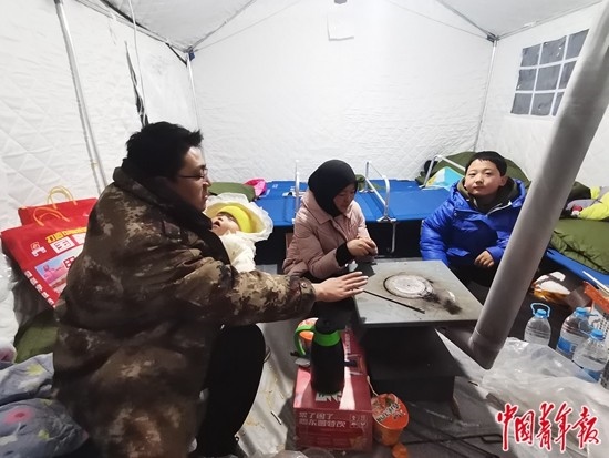 12月19日晚,甘肅省積石山縣大河家鎮(zhèn)一處安置點,30歲的馬繼云一家在安置點帳篷里烤火爐。當(dāng)天他們收到了政府和愛心企業(yè)提供的生活物資,把一家人的生活安頓了下來。中青報·中青網(wǎng)記者 馬富春/攝