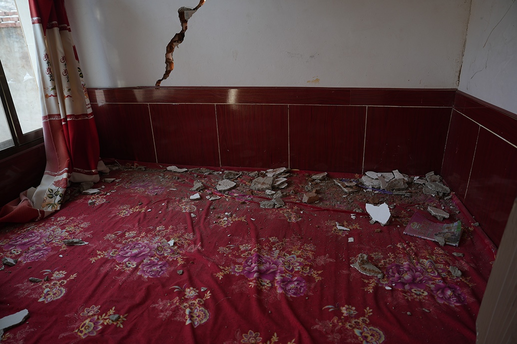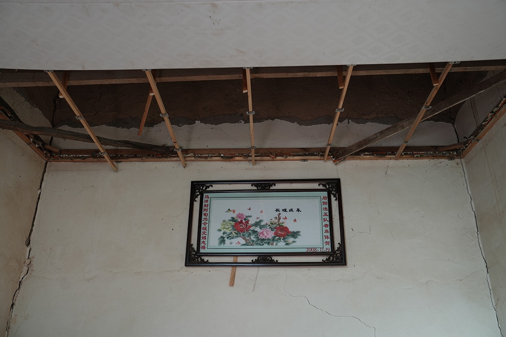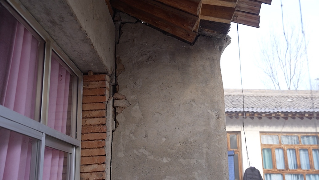 12月23日當(dāng)天,馬國(guó)忠和叔叔伯伯兩家都在家門前搭起剛領(lǐng)的帳篷。叔叔馬進(jìn)明家受損嚴(yán)重,兩堵磚墻的銜接處完全開裂,像條拉鏈被猛地拽下;天花板掉了大半,木頭架構(gòu)的屋頂赫然露在豁口里。所幸,他和家人平時(shí)在縣城租房住。