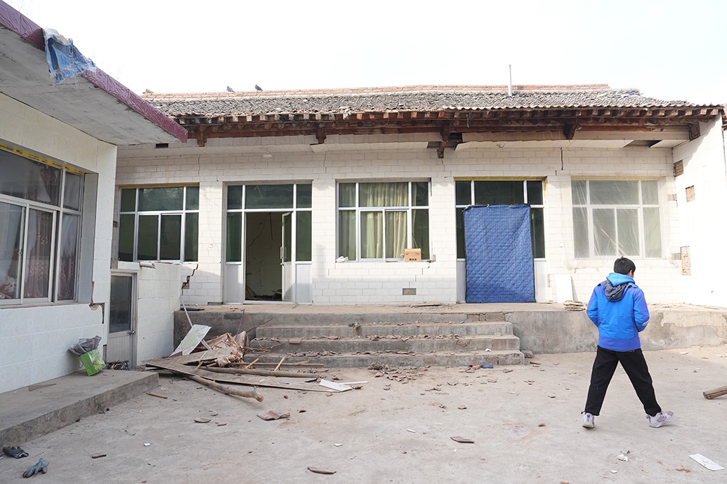 震后,他家木頭架構(gòu)的屋頂傾斜了些,磚瓦墻多處開裂,土炕也裂了,柴火的煙從裂縫滲出,有些嗆人。原則上,他家是不能再進(jìn)入了,但上課的話,房間更舒適暖和點(diǎn)。