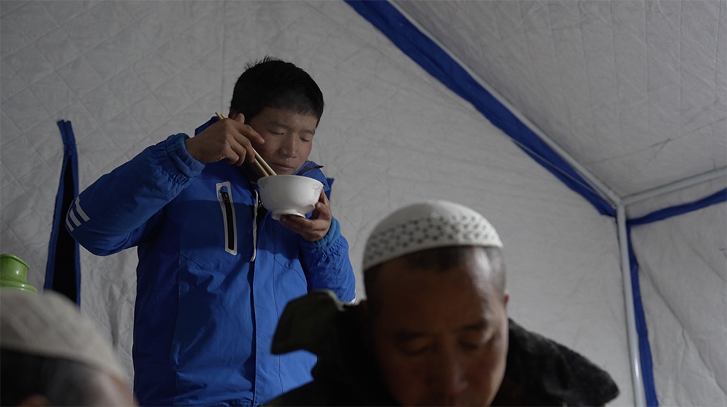 各家的小孩難得聚在一起,趁著大人忙活,竄來竄去。臨傍晚玩累了,還沒吃飯就在帳篷打起瞌睡。馬國(guó)忠下了課,跟父親去喂牛,他手腳麻利地扛了袋近百斤的飼料放推車?yán)?,踩著積雪向牛棚走去。