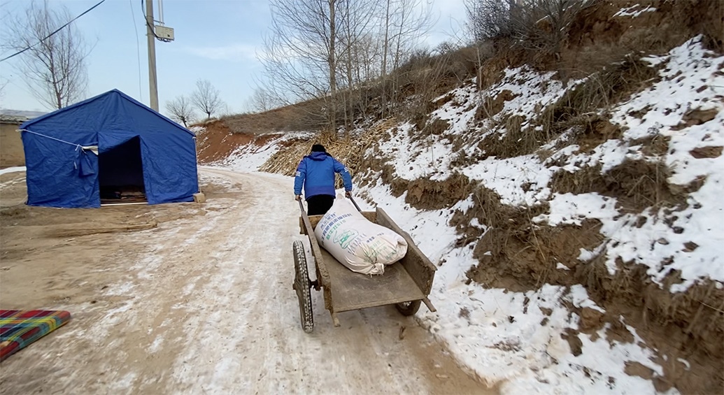 他說發(fā)放物資面臨的最大難題,是住戶過于分散,說著,他轉(zhuǎn)身指向背后整座山,“能看見的這一山,全部是我們村的”,住得遠(yuǎn)的,離村委會(huì)有六七里地,要是靠居民自提,人可能“凍得身體都找不著”。他也顧慮,山里地勢(shì)崎嶇,后期安置用的活動(dòng)板房可能難以搭建。