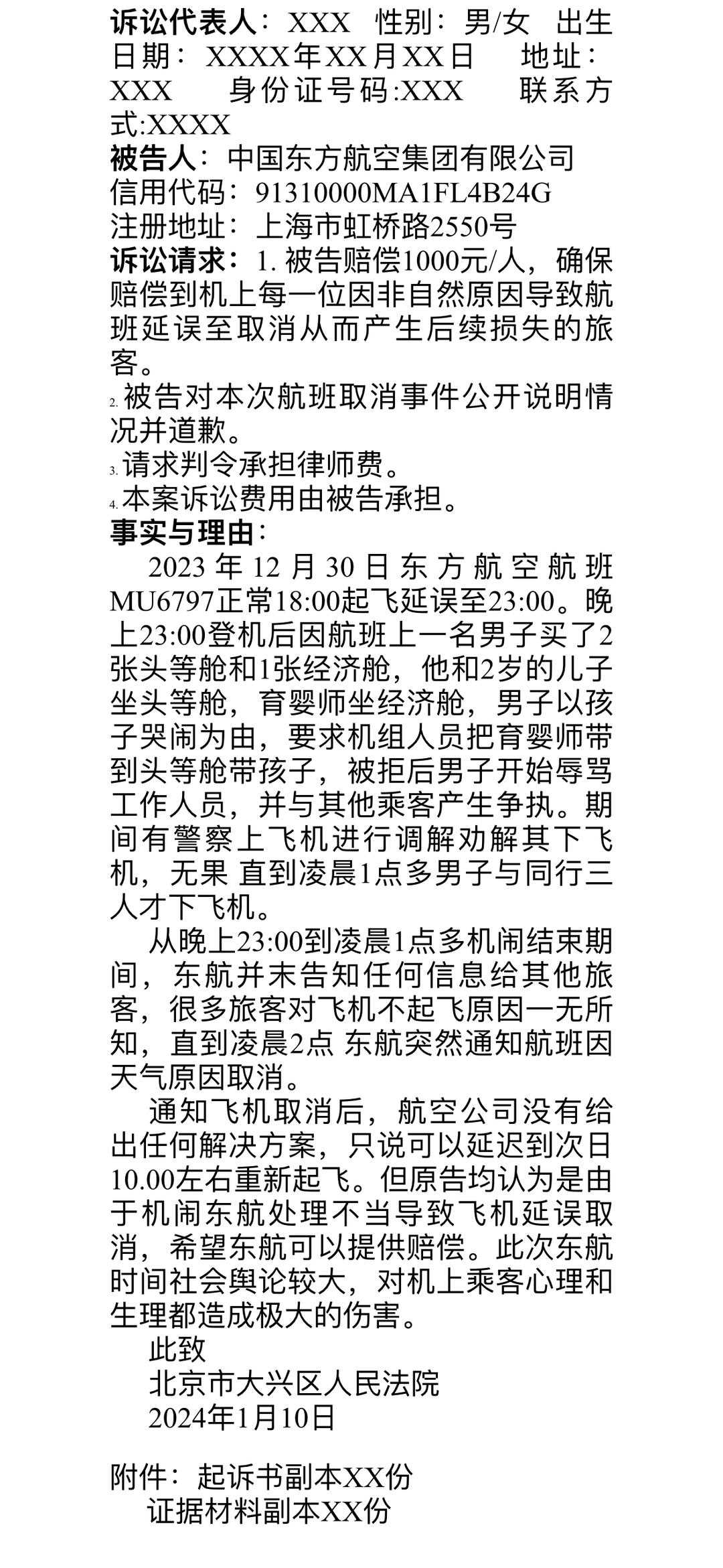 群內(nèi)發(fā)出的起訴書寫道:“從當(dāng)日23點到次日凌晨1點多機鬧結(jié)束期間,東航并未告知任何信息給其他旅客,很多旅客對飛機不起飛原因一無所知,直到凌晨2點,東航突然通知航班因天氣原因取消。通知飛機取消后,航空公司沒有給出任何解決方案,只說可以延遲到次日10點左右重新起飛。但原告均認(rèn)為是由于機鬧,東航處理不當(dāng),導(dǎo)致飛機延誤取消,希望東航可以提供賠償。此次東航事件社會輿論較大,對機上乘客心理和生理都造成極大的傷害。”據(jù)悉,乘客們擬起訴至北京市大興區(qū)人民法院。