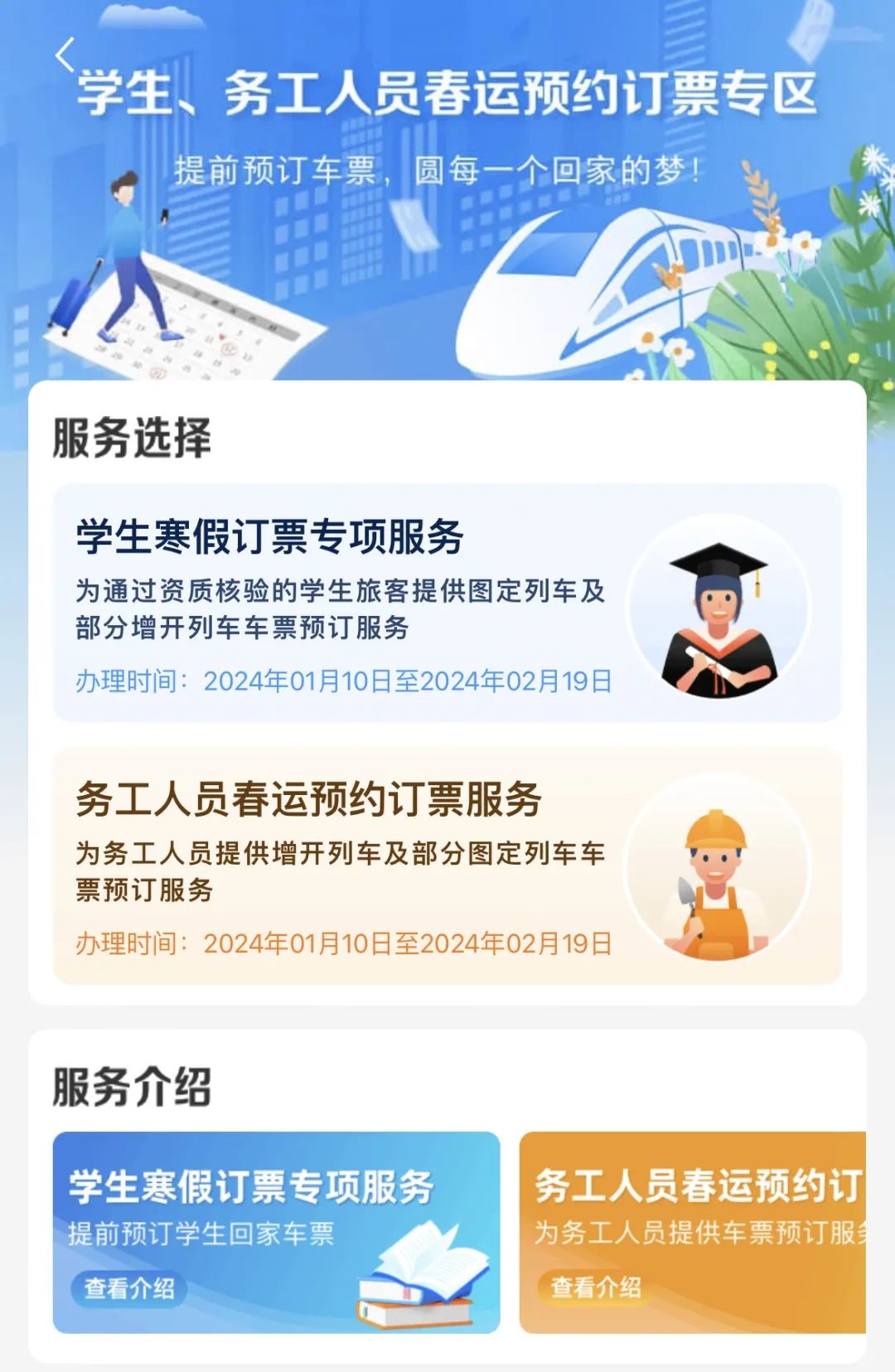 為認真貫徹落實黨中央國務院關于做好2024年元旦春節(jié)期間有關工作的要求,保障學生、務工人員等重點群體春運出行,鐵路12306創(chuàng)新服務舉措,為學生、務工人員推出了售票服務專區(qū)。自1月10日起,符合條件的學生旅客(已通過學生優(yōu)惠資質核驗且有剩余優(yōu)惠乘車次數(shù))可通過“學生寒假訂票專項服務”專區(qū)預約購買春運期間(1月26日至3月5日)火車票,每名旅客最多可同時提交6個預約訂單,每個訂單可添加1個乘車日期的20個“車次+席別”的組合,可選席別為學生優(yōu)惠票適用的硬座、硬臥、二等座。已通過實名制核驗的務工人員可通過“務工人員春運預約訂票服務”專區(qū)預約購買春運期間火車票,每名旅客可同時提交6個預約訂單,每個訂單可選擇“時間+車次+席別”的1個組合。