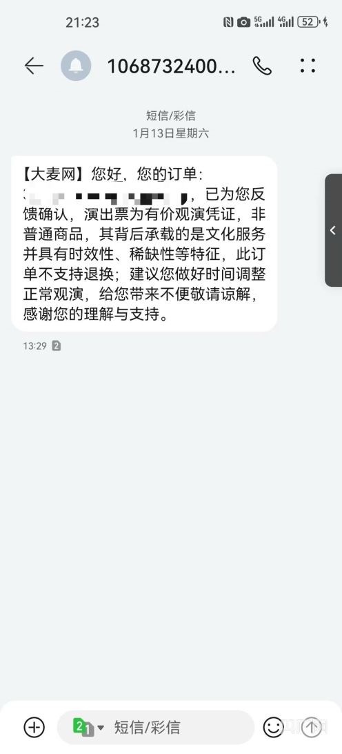 周女士說自己第一時間就通過多個渠道嘗試退票,但都沒有成功?!叭斯た头墓ぷ鲿r間是早上9點到晚上8點,我打電話的時候不在他們工作時間范圍內(nèi)。當時也確實聯(lián)系不到其他渠道,于是我就在12315,包括黑貓投訴進行退票退款的申請。13號早上9點,大麥客服說此訂單不支持退換,13號下午1點半的時候,給了我一個反饋短信,說是已為我反饋確認,演出票為有價觀影憑證非普通商品,其背后承載的是文化服務,并具有時效性、稀缺性等特征,此訂單不支持退換,然后就建議我做好時間調(diào)整正常觀演?!?/p>