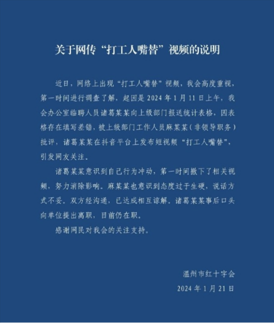 ·溫州市紅十字會回應網傳“打工人嘴替”視頻:表格填錯被批評引發(fā),雙方認識到自己不足已諒解。
