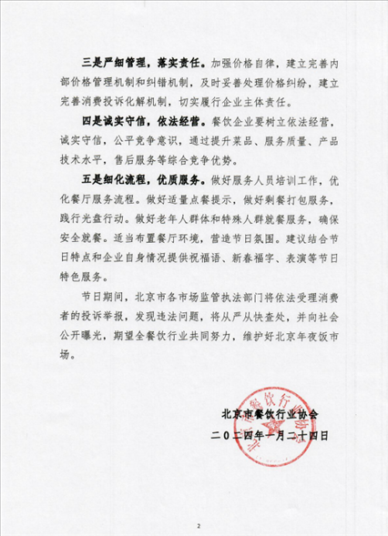 央視網(wǎng)消息:據(jù)北京市餐飲行業(yè)協(xié)會公眾號消息,據(jù)為進一步規(guī)范北京年夜飯市場秩序,營造首都良好節(jié)日餐飲消費環(huán)境,保障消費者合法權益,讓廣大市民體驗到優(yōu)質的年夜飯服務。同時,更好地杜絕虛假價格、價質不符、不合理定價、不合規(guī)收費等不規(guī)范行為,北京市餐飲行業(yè)協(xié)會特發(fā)布如下倡議: