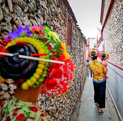 泉州市蟳埔村,蟳埔女挑起竹籃和彩燈,盛裝出行。王志超攝