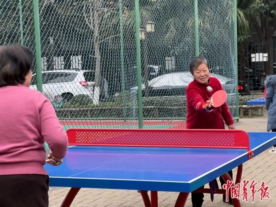 小孩子在追逐嬉鬧,老人們手拿乒乓球拍切磋技藝。不冷的冬日中,成都市青羊區(qū)蘇坡街道清波社區(qū)黨群服務(wù)中心門前的廣場十分熱鬧。