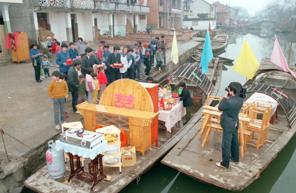 1990年春節(jié)前夕,紹興紅江村的章如花嫁到了一里外的檀瀆村。新郎迎娶新娘所用的交通工具,不是汽車,也不是花轎,而是水鄉(xiāng)里常見的船。富裕起來的水鄉(xiāng)農(nóng)民在遵循傳統(tǒng)禮儀的同時,也為婚禮增添了現(xiàn)代色彩。比如,陪嫁中少不得電視、煤氣罐;新娘少不得燙發(fā);另一件少不得的,是用攝像機(jī)記錄下婚禮的全部過程,作為一輩子的紀(jì)念。