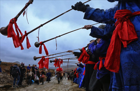 2016年春節(jié)前夕,貴州省惠水縣擺榜鄉(xiāng)石板村村民陳志良按照當(dāng)?shù)鼗樗子怯涝?,新郎接親隊伍長鳴長號迎娶新娘。