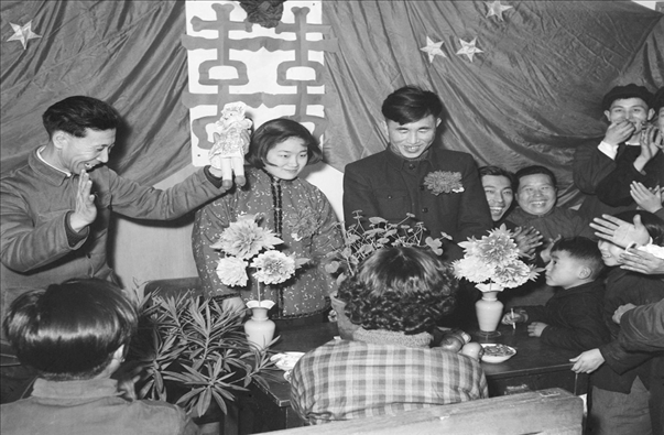 1957年春節(jié),遼寧省沈陽風(fēng)動工具廠的工人鞠復(fù)海(新郎)和俞鳳仙(新娘)在婚禮儀式上接受朋友們的祝賀。