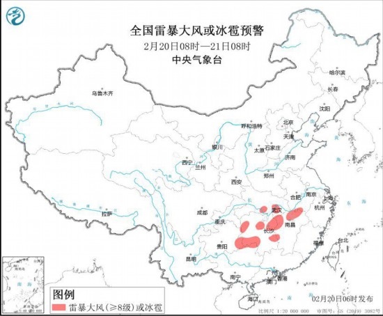 預(yù)計(jì)2月20日8時(shí)至21日8時(shí),安徽西南部、湖北東部和南部、湖南中北部和西南部、江西中北部、貴州東南部、廣西東北部等地的局地將有8-10級(jí)雷暴大風(fēng)或冰雹天氣;安徽中南部、江蘇西南部、湖北東部、湖南南部和西部、江西北部、廣西東北部等地的部分地區(qū)將有短時(shí)強(qiáng)降水天氣,最大小時(shí)雨量20-30毫米,局地可達(dá)35毫米以上。