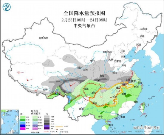 全國(guó)降水量預(yù)報(bào)圖(2月22日8時(shí)-23日8時(shí))