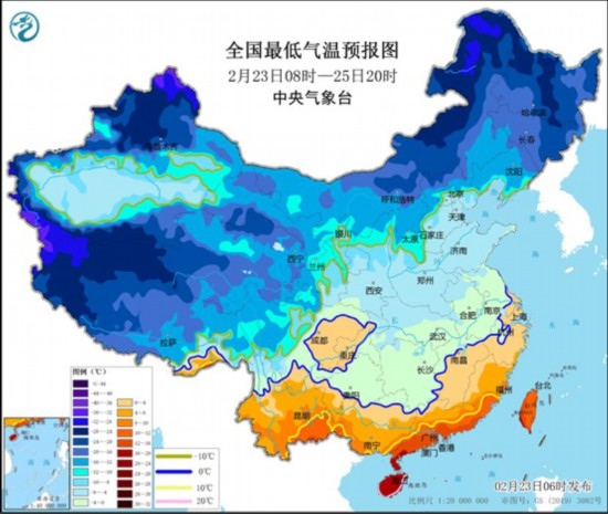 全國最低氣溫預(yù)報圖(2月23日8時-25日20時)